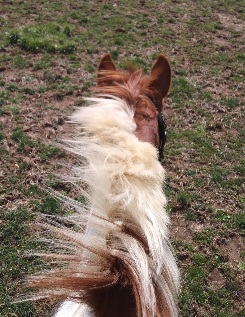 Day 59: After a few days of light exercise and straight rest, I rode Demi bareback. I practiced mimicking the elastic, constant outside rein, and had no problem with lead!